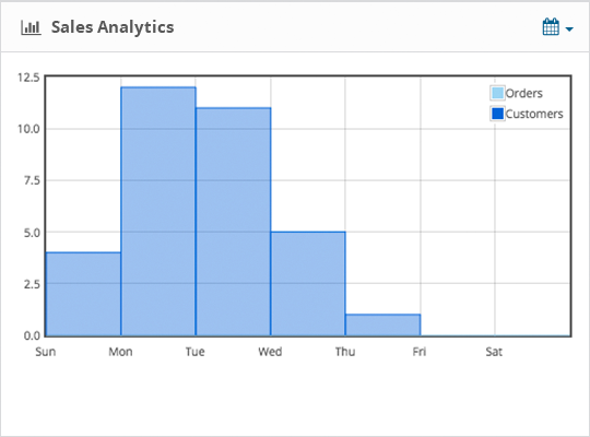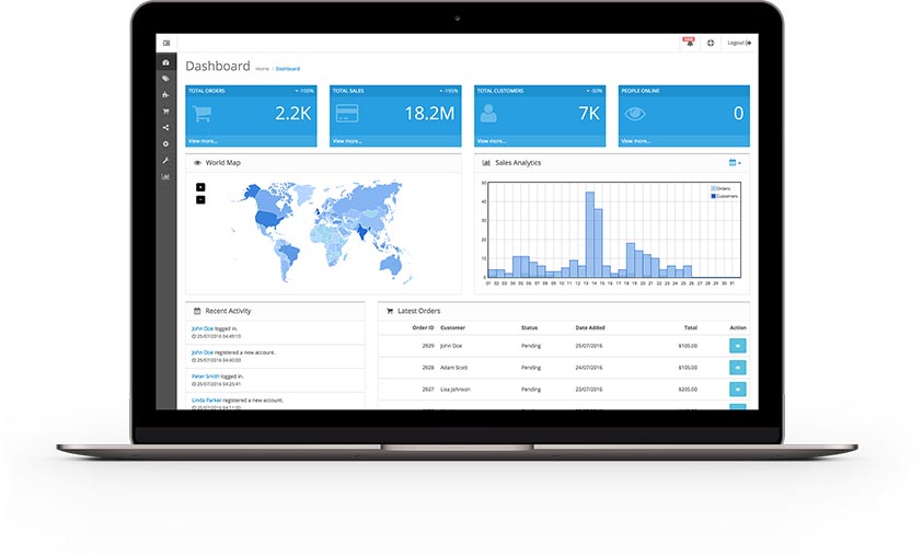 All the important information available at a glimpse. Get a full overview of what is important with total orders, sales, customers, people online, sales analytics and many more widgets