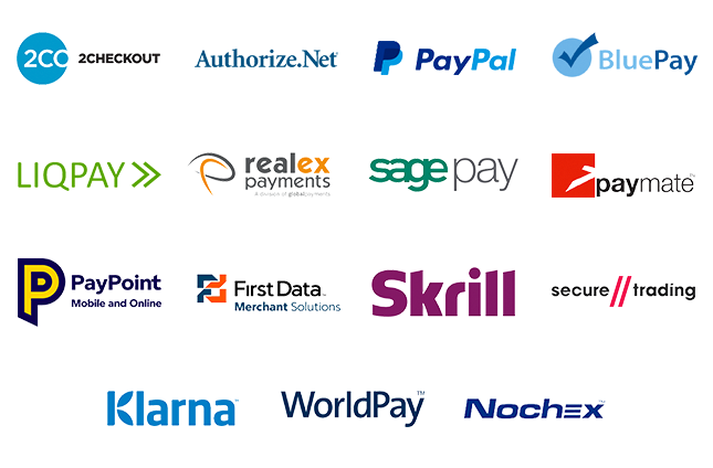 Authorize.Net, Amazon Payments, First Data, Klarna, LiqPay, Skrill, PayPal, SagePay and many more. Choose any of the 51 Payment methods that come integrated with or download among hundreds more available from the marketplace.