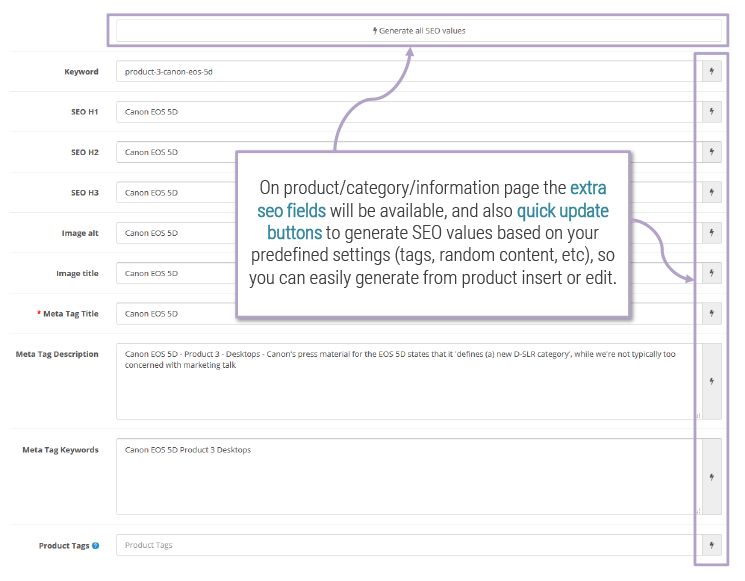 These tools will allow you to complete essential SEO tasks automatically to all products in your store! From 1 to 1,000,000 products your SEO optimisation process will be achieved with a couple of clicks!