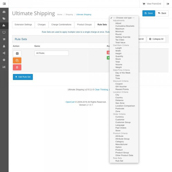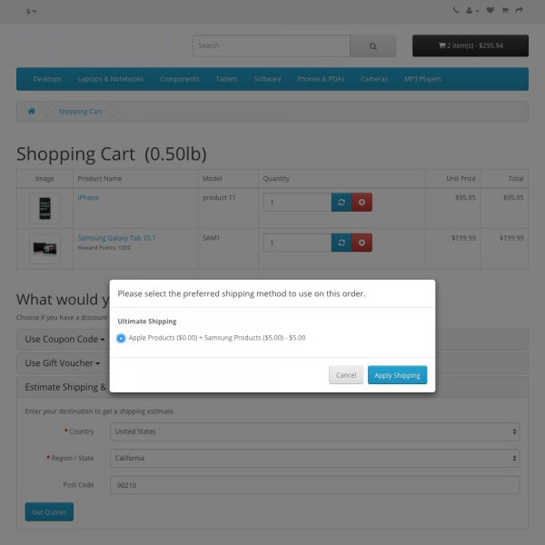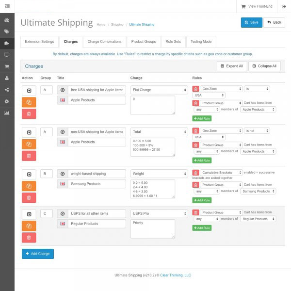 Create shipping charges based on any criteria you want! Ultimate Shipping uses an intuitive "rules" system to easily determine when your shipping charges appear. Set standard rates (such as based on total or weight) or live rates (such as UPS or FedEx) for individual products or groups of products, and then combine the charges together into a single charge displayed to the customer.