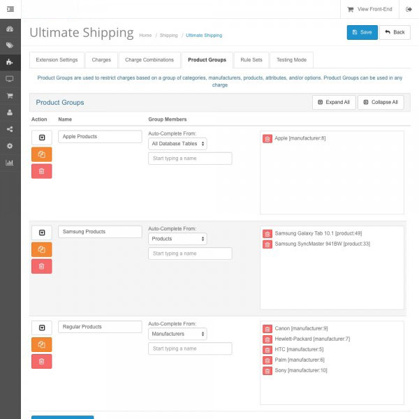 - Group products, categories, manufacturers, options, and attributes together however you want to create Product Groups. These groups can then be used to determine when charges apply to products, and which products to which they apply.